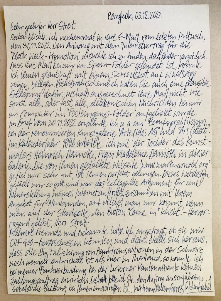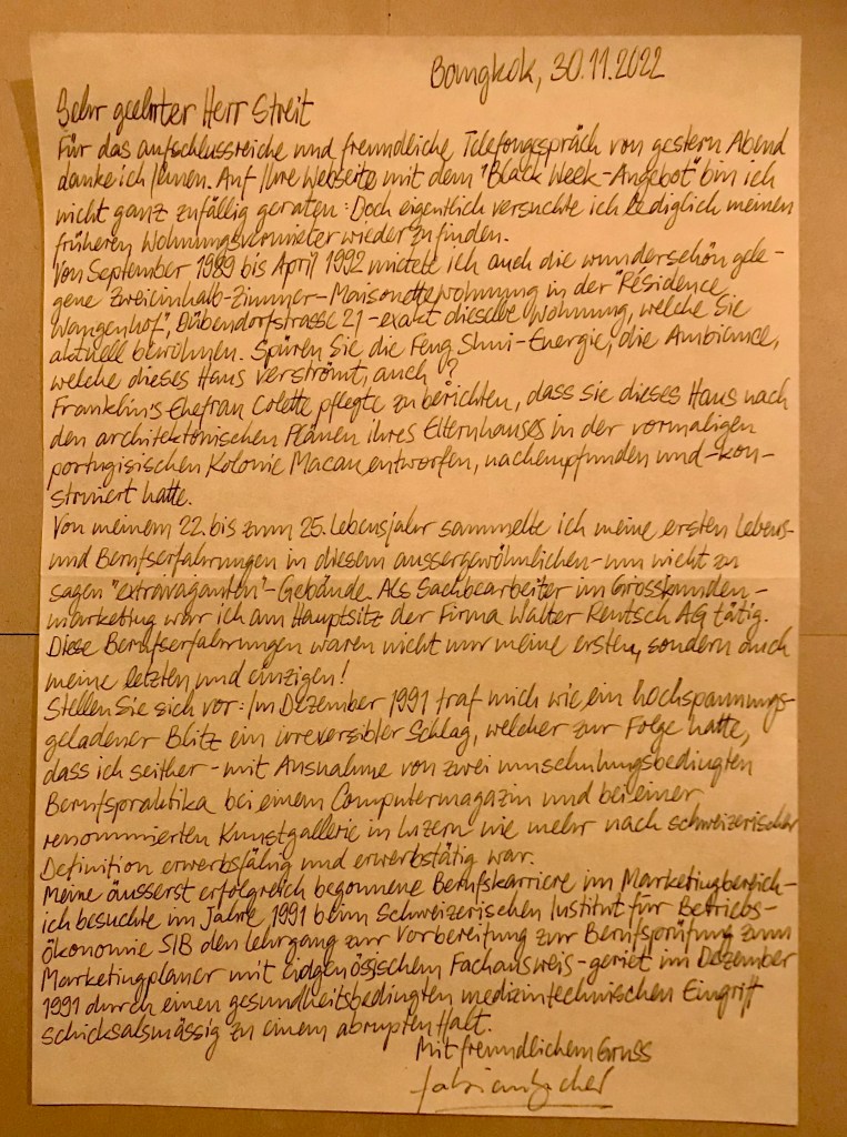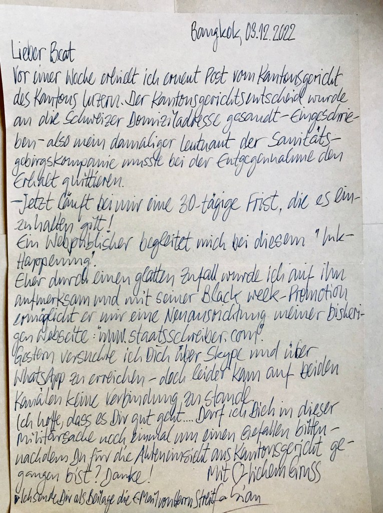 Bereits einen Tag nach unserem ausführlichen Telefongespräch Mitte Dezember 2021 begann ich, einen mehrseitigen Dankesbrief an Dich zu schreiben. Nach dem Lesen des Essays befand ich ihn als «Zuviel des Guten» und legte ihn beiseite (mit der nächsten Luftpost sende ich Dir die erste Originalseite nach – zu Deiner Information).