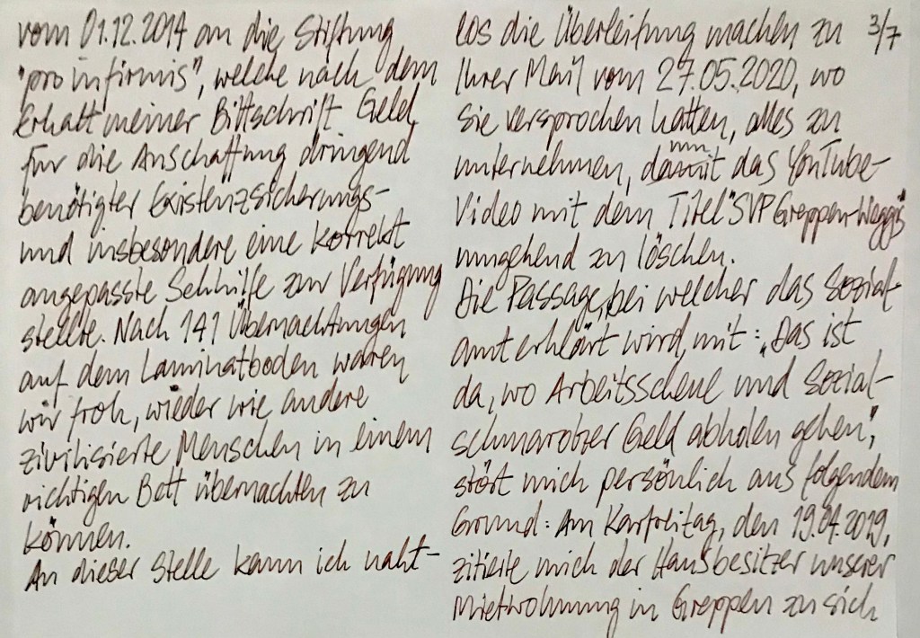 Während der Schulferien im Sommer 2020 konnte ich zweimal die mit der Schweizer Schule vereinbarten Schulgelder nicht begleichen. – Zusammen mit den Behördengängen, der alten Brille, mit welcher ich auch grösseres Kleingedrucktes nicht mehr konzentriert lesen konnte, liess mich verzweifeln. So meldete ich dem zuständigen Fachbearbeiter für Invalidenrenten bei der ZAS, Herrn Serge Pilet, und dem vormaligen Schulleiter der Schweizer Schule, Herrn Simon Dörig, das Unfassbare; ich sagte: «Gleich dem Altersrentner, Herrn Daniel Schärer, den ich im Zeitraum zwischen 2010 und 2014 in Bangkok kennengelernt hatte, und der (auch) aus finanziellen Gründen sich das Leben genommen hatte, wollte ich es ihm gleichtun.